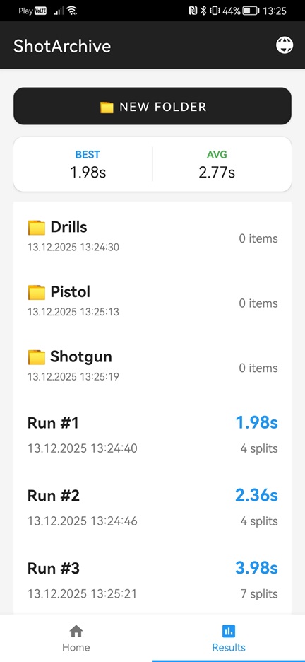 ShotArchive is an Android application designed to store and organize shooting results from the Special Pie M1A2+ timer. Unlike the timer's internal memory limitations, ShotArchive allows you to save unlimited results and arrange them in custom folders for clear and efficient score management.