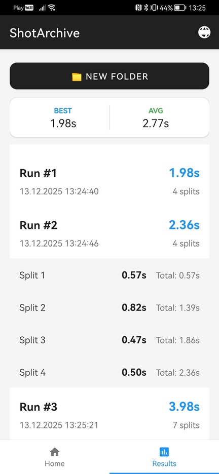 ShotArchive is an Android application designed to store and organize shooting results from the Special Pie M1A2+ timer. Unlike the timer's internal memory limitations, ShotArchive allows you to save unlimited results and arrange them in custom folders for clear and efficient score management.